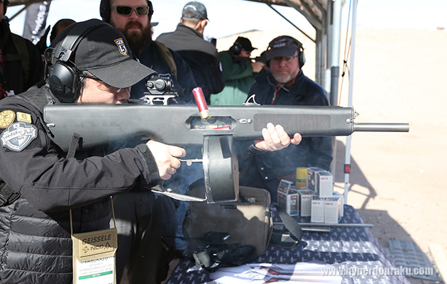Sol Invictus Armsでは民間用のAA-12セミオートモデルを発売。それにあたり、レンジデーではフルオートモデルのAA-12が試射できた。