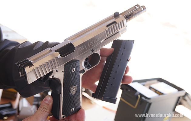 Arsenal FirearmsのAF2011A1 Duellerも撃つことができた。.45ACPのダブルバレル1911で、ワントリガーで同時に.45口径をぶっ放す。グリップもダブルサイズでリコイルもダブル! 何から何まで二倍の迫力でどこに弾が飛んでいっているかわからないほどだった。完全にネタガンである。