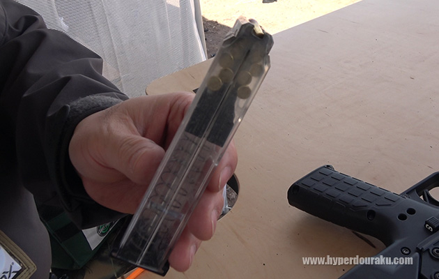 マガジンキャパシティは9mmを7発。樹脂製のクリアマガジンというのも面白い。