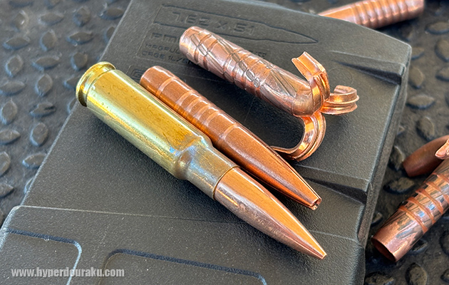 Q Reptilia Honey Badger Boombox 8.6mm BLKで使用される特殊な8.6mm弾。試射会場では皆が「.338 Black Out(スリースリーエイトブラックアウト)」と呼んでいた。長大な超重量弾頭をサブソニック(亜音速)で撃ち出すコンセプト。ストッピングパワーも強烈だろう。カートリッジ全体としては7.62mmNATO弾とほぼ同サイズでAR-10のマガジンが共用できる。