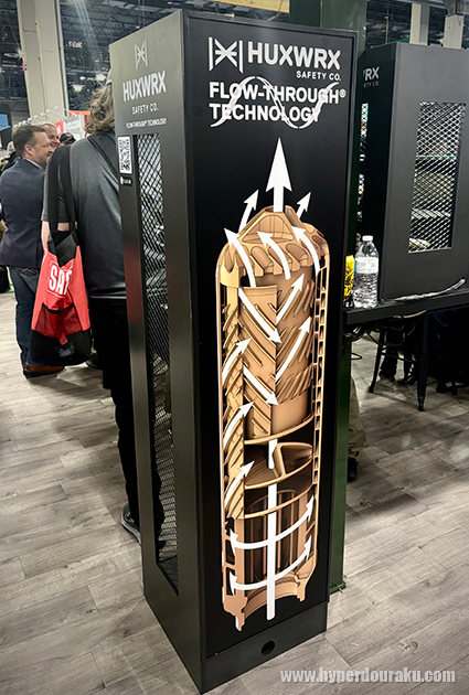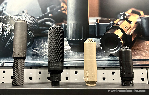 もうひとつ今回のSHOTSHOWで印象に残ったのは各種サプレッサーの目覚ましい進化・発展ぶりだ。サプレッサー製造メイカーだけでなく、大手の銃器メイカーでもサプレッサーとの相性や性能低下のなさを盛んにアピールしていた。発射ガスをサプレッサー内部でどのように処理し効率よく排出するか?を判り易く展示していたHUXWRX社のブース。