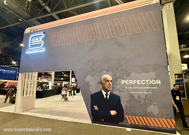 昨年亡くなった創業者ガストン・グロック氏の座右の銘であり現在は社是にもなっている「PERFECTION(=完璧)」の意思を「未来永劫まで継承する」という確固たる決意を感じさせたグロックの巨大ブース。「売上げおよび軍・法執行機関への採用実績世界No.1のハンドガン帝国」を引き継ぐ若き女王=キャサリン・グロック氏もブースに来臨し、積極的に来場者とのコミュニケーションを図っていた。