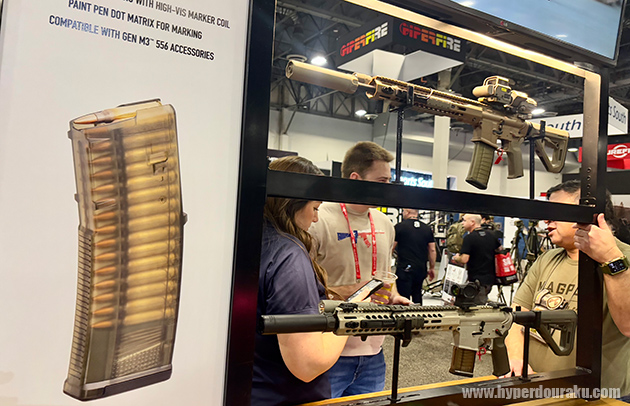 巨大ブースに元特殊部隊メンバー等の豪華ゲストを呼び、着ぐるみキャラクターまで投入してイベントを盛り上げていたMAGPULブース。25年前にはデスク2つだけの小さなブースで社長ともう一人だけで出展・・・だったのを目撃しているだけに、「アメリカンドリームが確かに存在する」という事実を再確認した思いだった。透明樹脂で作られたT-MAG、とても良い! P-MAGのGEN M3(第3世代)と互換性があり快適に使用できる、との事だった。