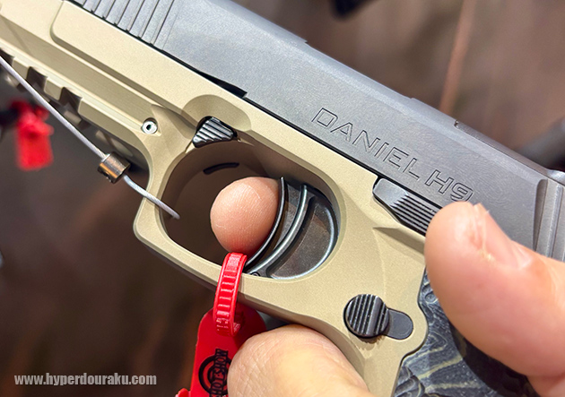 M1911系のような直引きタイプトリガーが良い感じ。下側が支点になったトリガーセフティもユニークだ。筆者のようにM1911系に慣れた射手が目を閉じた状態でパッと構えた後に開眼した場合、グロックだと銃がかなり上を向いてしまうのだが、このダニエルH9はきちんとオンサイトで狙えた・・・・・・という事はつまり「グリップアングルが1911系とほぼ同じ」なのを意味する。これは多くのシューターに歓迎される仕様だと思う。
