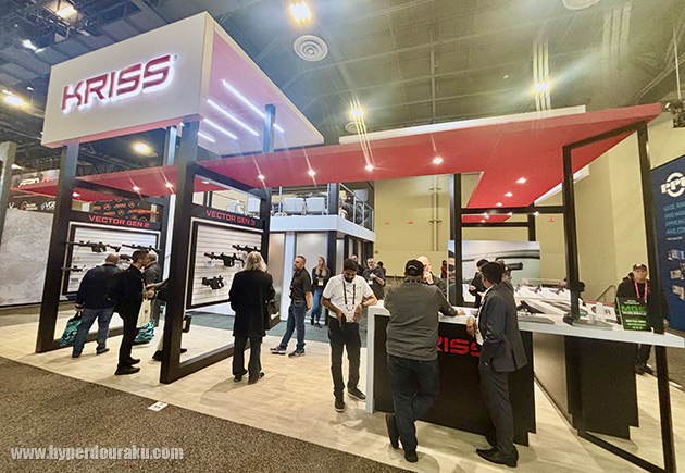 KRISSのブースでは看板商品であるVECTORのGEN1からGEN3までを、標準型、ストック付きのロングカービン、ストックレスのピストルタイプ、さらには