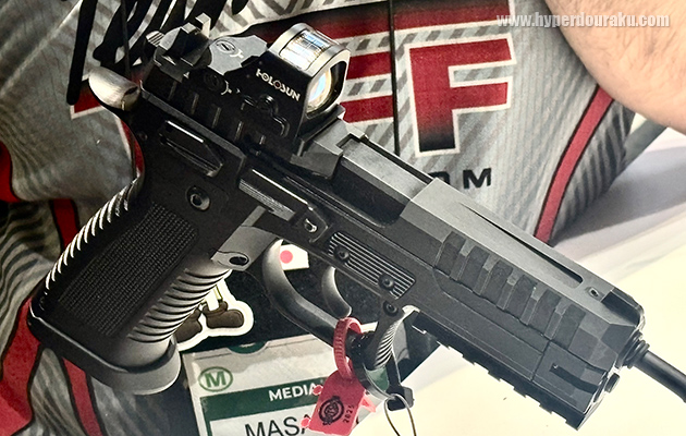 KRISSからは同社肝入りの新型拳銃KYMERA(キメラ)が初公開された。各部のディテールは最新モデルらしくメカニカルな感じだが、作動方式は今どきの新製品としてはもはや珍しいDA/SA。さらにスライドの厚みがかなりある上、CZのようにフレームがスライドを包み込むデザインなので銃のボリューム感が相当にあるのだ。もしかしたらKRISSはこの拳銃に於いてもVECTORと同様、独特なスタイリングやコンセプトを利用してゲームや映画でのイメージ戦略を武器に、エアソフトガンやモデルガンとしての展開も含んだ総合戦略を狙っているのかもしれない。「この厚みなら樹脂スライドでも充分な強度&剛性が得られそうな感じだなぁ」と思ったもので(笑)。