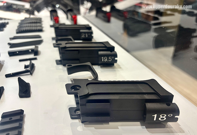 KYMERAはグリップのサイズや厚み、ダストカバーの形状とレールの有無、左右ガスペダルの有無等を自由自在にセッティングできるモジュラーハンドガンだ。そして最もユニークなのが軽合金フレームの交換でグリップの角度を1911系とほぼ同じ「18度」、グロックに近い「21度」、そしてその中間の「19.5度」と3種類のセッティングができる点だろう。