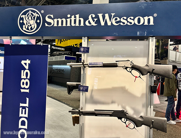 巨大なブースでM&P-15ライフルやリボルバー、ショットガン等をフルラインナップで展示していたスミス・アンド・ウェッソン。ここ数年で非常に盛り上がっている分野がステンレス・スティールや複合素材ストック、さらにピカティニーレールの装備で現代仕様にバージョンアップされたM1854レバーアクションライフルなのだという。