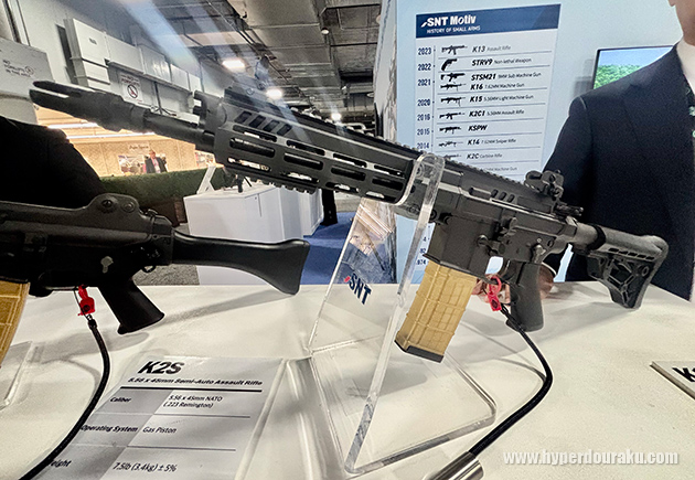 韓国軍の最新型制式採用ライフルK-13も展示されていた。口径は5.56mm。ブースには韓国軍の制式ライフル年表も誇らしく飾られていた。
