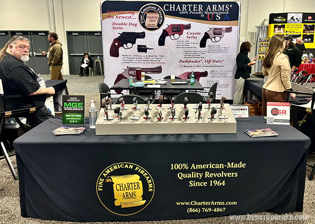 あの「ブルドッグ.44スペシャル」で有名なチャーターアームズも、小さなブースながらしっかり出展していた! 9mmまたは.357マグナムを撃つ「ダブルドッグ」や、.380ACPで軽量かつ可愛い仕上げの「コヨーテ」といったシリーズで伝統的な5連発リボルバーのラインナップを現在もしっかり継承。「100%アメリカンメイド」のプライドを体現するかのような迫力満点の男性が丁寧に商品説明をして下さった。