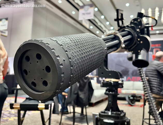 M134Aミニガンのフィーダーや発射速度レギュレーターなど、米軍も認める実用的カスタマイズで実績のあるDILLON AERO社のブースにはなんとミニガン用サプレッサーが展示されていた! しかし写真をよく見るとカタチだけのモックアップっぽくも見える。何はともあれ「作ろうという意思」が存在する事は確かだ。