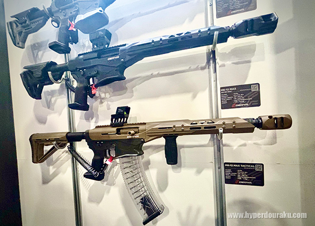 「操作系レイアウトがARライフルとと殆ど同じ.12ゲージ・セミオートショットガン」としていま大注目の DERYA(デリヤ)MK-12MAX。「3ガンマッチには最高だぜ!」とブースの方も仰っていた。ショットシェルが9発入るトランスルーセント(透明)のロングマガジンが凄い!
