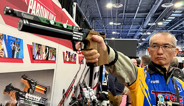 イタリアの精密射撃銃の名門、PARDINI(パルディーニ)のブースにて「無課金おじさん」を気取る筆者。