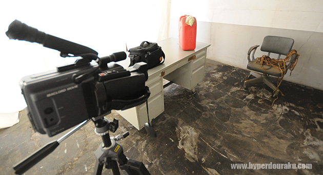 ポツンと椅子があり、荒縄が生々しく垂れ下がっている。そしてポリタンクとビデオカメラがこれ見よがしに。