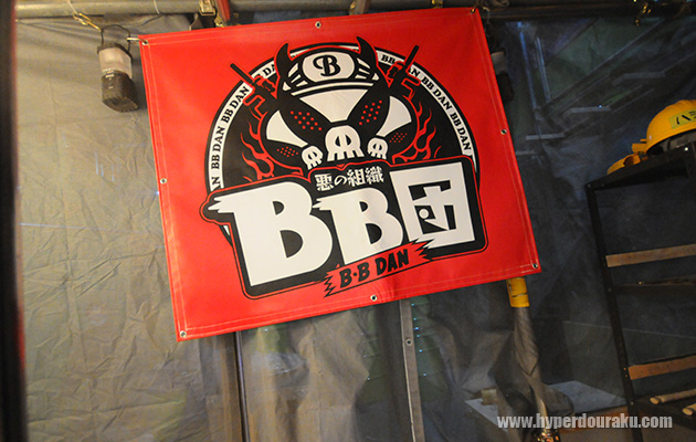 フィールド入口には「悪の組織 BB団」の旗が飾られている。
