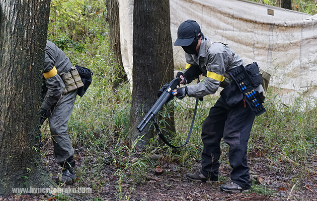 もちろんトレポンのみならず、みな思い思いのエアソフトで戦う。このプレーヤーはソーコムのガスガンと、ハイキャパEの電ハン二丁持ちのハンドガンナー。機敏に立ち回っていてカッコよかった。