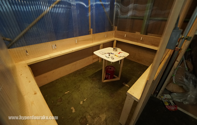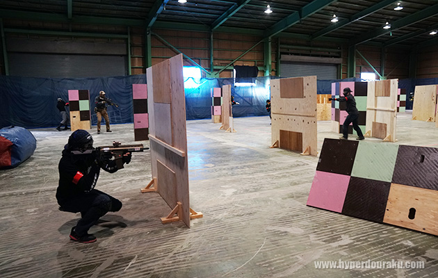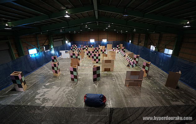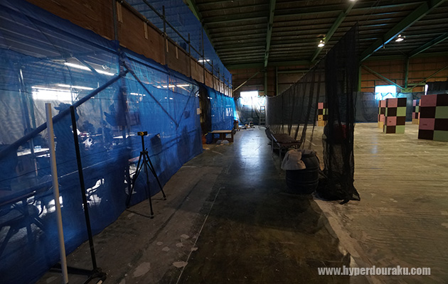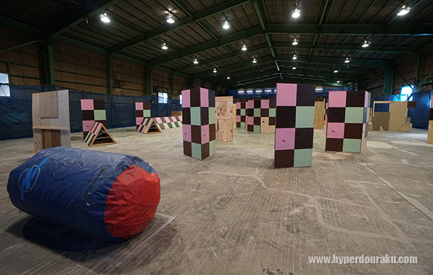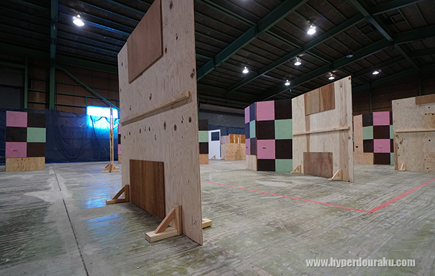 フィールド内にはコンパネで作られたバリケードが多数設置されていて、跳弾防止のためのクッションタイルが張られている。また外周ネットは2重構造となっていて、1枚目の4mm目ネットをBB弾が突き抜けて、2枚目のネットで止まる跳弾防止策が施されている。