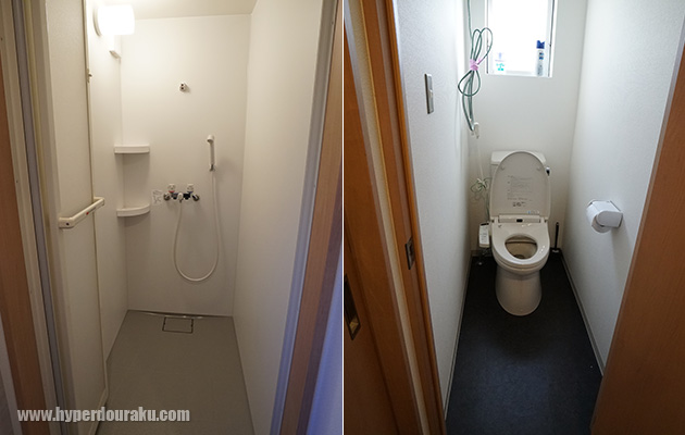男女別のシャワールーム、ウォシュレット付き水洗洋式トイレ完備。