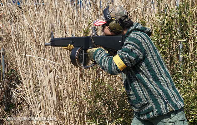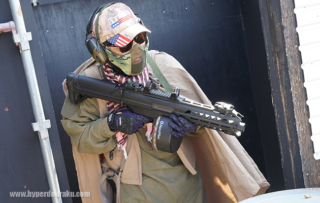 マルイのAA-12、SGR-12といった電動ショットガンはフルオートで3発同時発射という比類なき制圧力を発揮する。発売前から多くのフィールド定例会で使用禁止になったこともあって使用する機会の少ないモデルでもあるが、ESCではここぞとばかりに、3000発の電動給弾ドラムマガジンでバリバリ撃ちまくっていた。