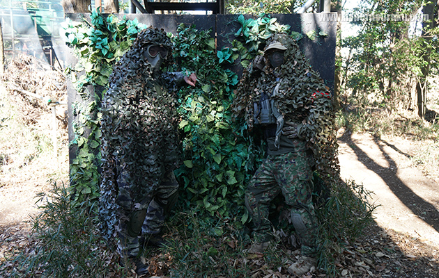 ギリーの最大の利点は被発見率の低下、つまり敵から見つかりにくくなるということだ。キッチリ擬装したプレイヤーは目の前数メートルに敵がいても気づかれない、なんてこともある。つまりはサバゲーにおいて敵からは見つかっておらず、自分は敵を見つけているという、圧倒的に有利な状況を作り出すことができるわけだ。