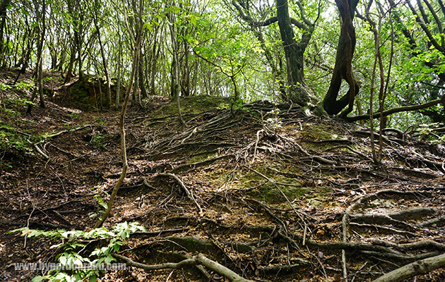 けもの道のような所を進んでいると、時折、急な斜面にはロープが打ち込まれており、それを使いながら登ることも下ることもできる。