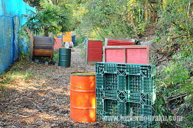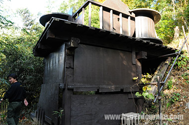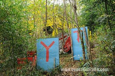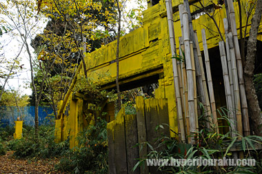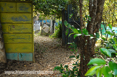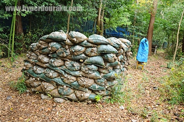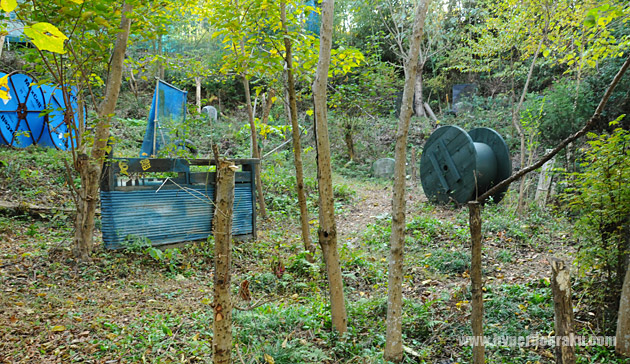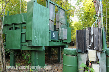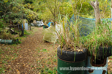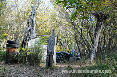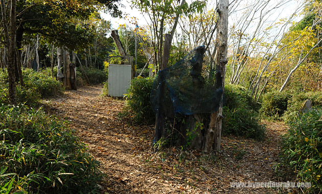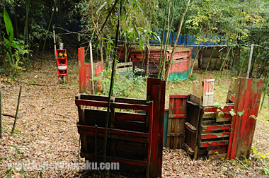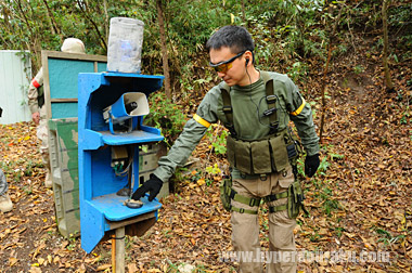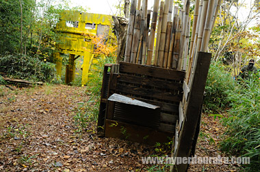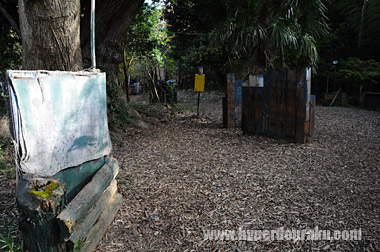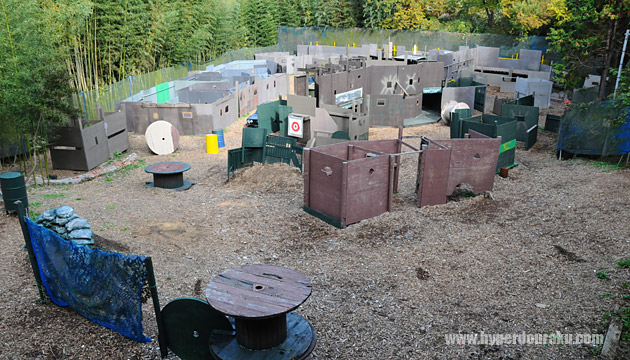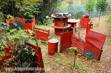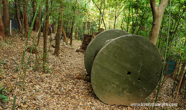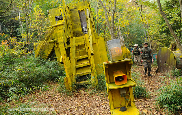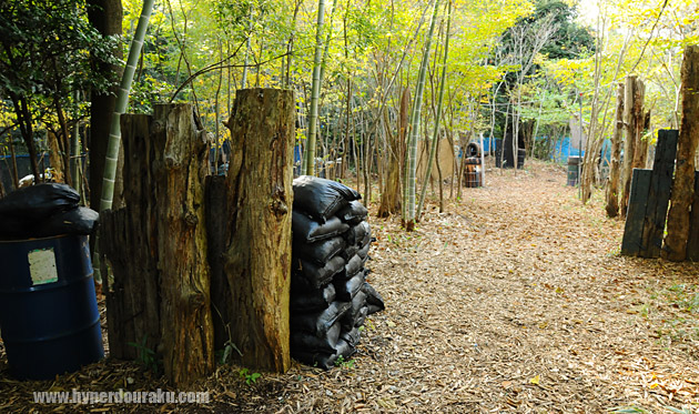 フィールド中央、斜面上段は鬱蒼とした森林となっている。フィールドバリケードとしてよく使用される通称"糸巻き"もODカラーに塗装され雰囲気を向上させるとともに、風雨による腐食防止にもなっている。