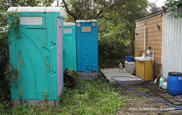 トイレは男女別の仮設タイプ。手洗い場もある。