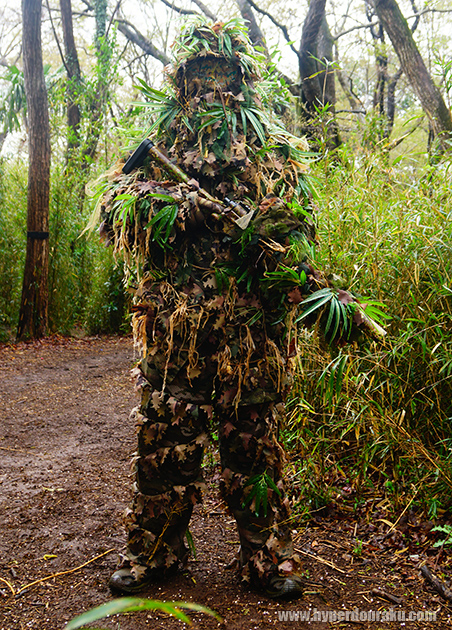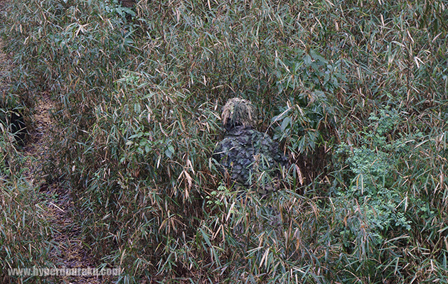 ギリーフードと上半身の偽装でこれだけ見えにくくなる。