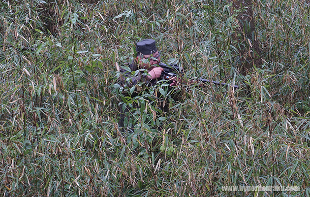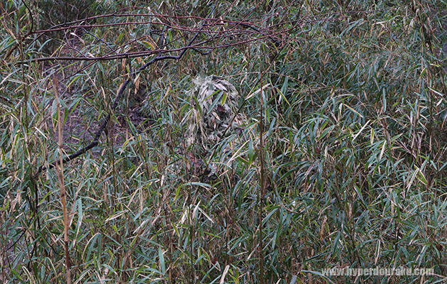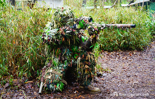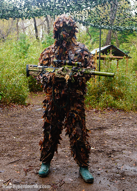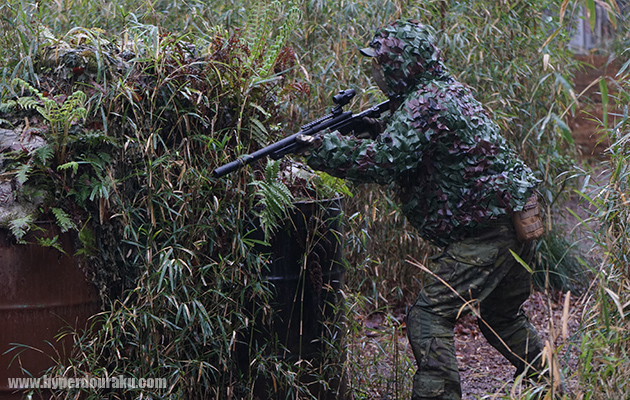 同じようなアングルでギリーを着込んだプレイヤー。フィールドの植生に合わせた笹のギリー。完全に溶け込んでいる。