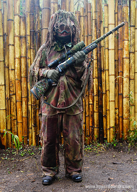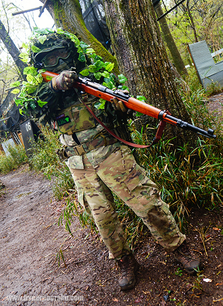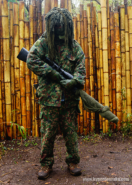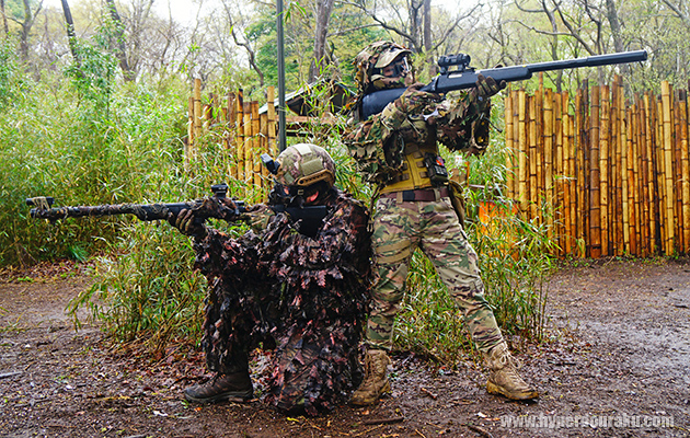 0.98Jの一律パワー制限下、連射できないボルトアクションライフルは電動ガンに比べて不利な点も多い。なので普段の定例会でもボルトアクションユーザーのマーカー着用は自由というルールがあったら、もっとギリースナイパーの活躍の場が増えるんじゃないかな。