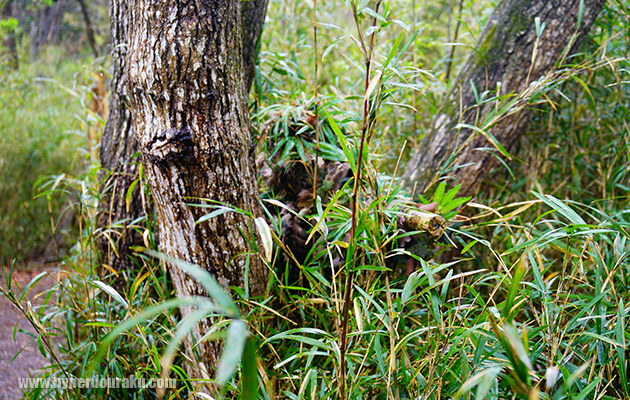 木の根元に隠れるギリープレイヤー。見つけるのは不可能な気がする...。