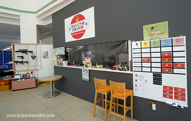 受付。シューティングレンジの利用料は1時間1000円。WEBサイトから予約が必要。