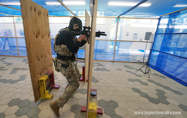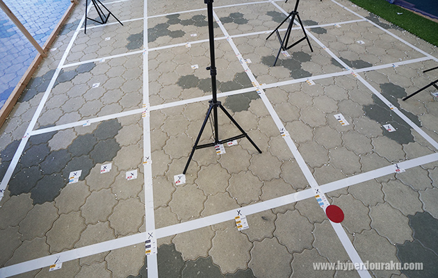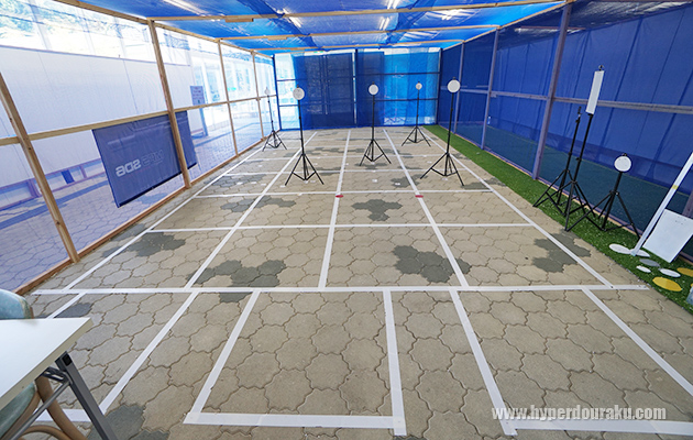 床にはさまざまなスピードシューティング競技用のプレート配置マーカーがあるので、スピーディーなターゲット設置が可能。