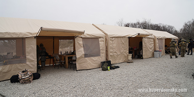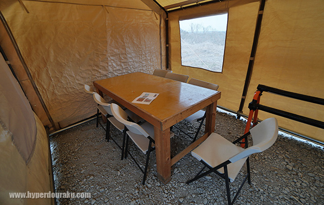 3つのテントに6席のテーブルが2つずつ、現状で36席分だったが、今後1テントが増設されて全48席になるそうだ。またテント内にはガンラックも設置されている。