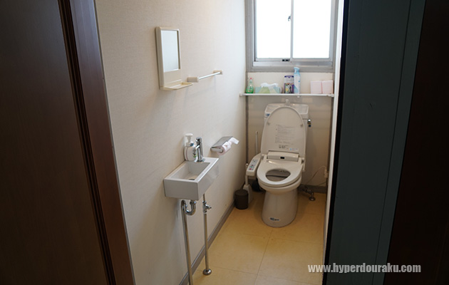 男女別の洋式水洗トイレは事務所の中。トイレはここにしかないので、用を足す際は毎回靴を脱がないといけないのがちょっと面倒か。