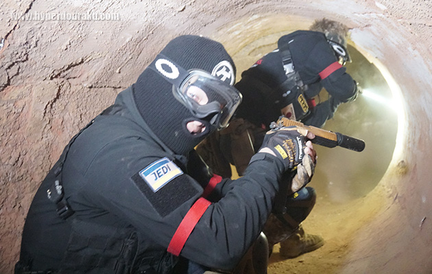 通路は圧迫感があって、途中に頑丈な扉などもあり、閂を蹴破っての突入訓練なども行えるそうだ。