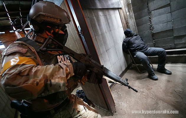 フィールド全体としては非常に作り込まれた施設であり、10vs10から最大でも15vs15くらいが適正プレー人数と言った感じ。1階部から侵入して建物の奥へ奥へと進行し、地下へ降りて最深部から捕虜を救出なんていうシチュエーションがリアルに体験できる。鉄骨とコンクリートによるハードな作りなのも緊張感が高まる要素。「鉄っぽさが怖い!」なんていうリアルな意見も聞かれた。
