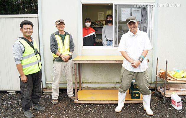 受付事務所。スタッフの皆さん。左から二番目がオーナーの藤田さん、右端がフィールドマスターの小田さん。藤田さん自身もサバゲーマーで朝礼のルール解説なども流暢に行っていた。