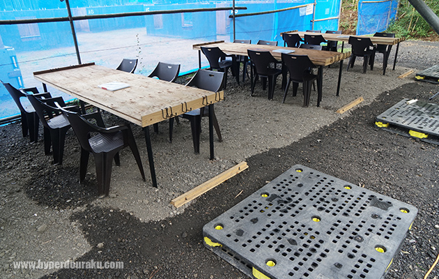 テーブルは6人掛けで、ガンラック、荷物置き用のパレットもある。まだオープンした手で照明や電源コンセントなどはなかったが、今後取り付けられるそうだ。