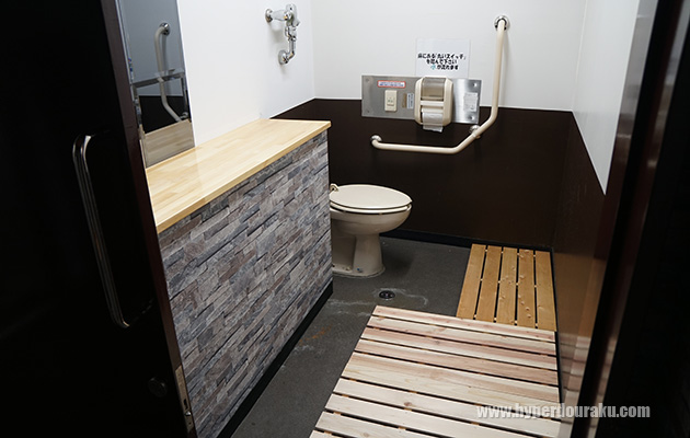 多目的トイレが女子更衣室になっている。男子更衣室はないのでトイレで着替えるしかないそう。セフティに試着室型の個室着替えルームがあっても良いかも。