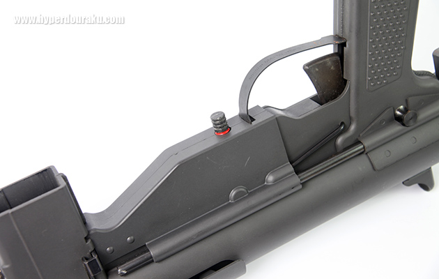 通称デベソ、実銃のグルースガンにはセフティがないためこんなところにセフティが設置された。BV式ガスガンのホース穴をそのまま利用。押し込むと赤いラインが消えセフティが掛かる。