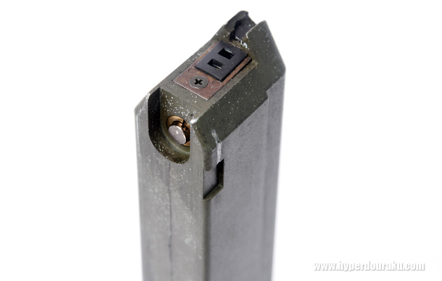 マガジンは亜鉛合金製で1kg超とかなり重い。上部にはふたつの穴が空いており、マルゼンのアドバンスシュートシステムであることがわかる。