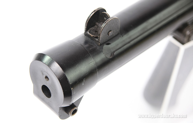 発射方式は外部パワーソースのBV式で、レシーバー後端から直接出ているホースにガスをつないで使用した。簡単にパワーを上げられる機構だっため、後にハイパワーブームを招く結果ともなってしまったのは古いエアガンファンならご存知の通り。言うまでもなく、取材した個体は内部ユニットが破壊され、現状ではBB弾の発射が不可能な状態にされている。