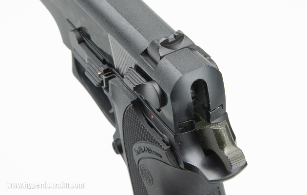 アンビセフティはライブ。デコック機能もあるが、固定スライドガスガンではデコックすると次弾発射時にダブルフィードしてしまうので一長一短だ。パーティングラインは綺麗に処理されている。