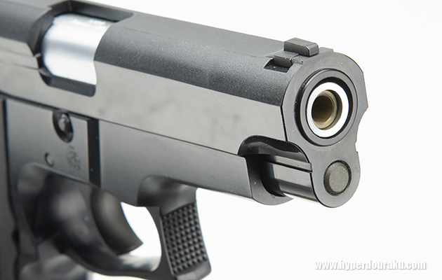 フロントサイトは樹脂製だが別パーツ。インナーバレルは真鍮製で、マズルギリギリまで伸びている。機構はトリガーに連動してインナーバレルが後退する後座式だ。