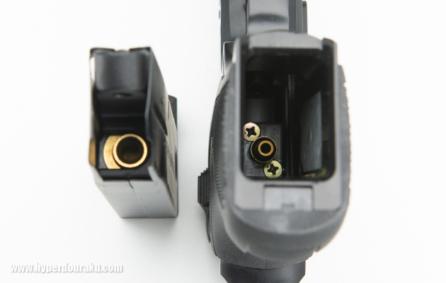 ただ、バルブは本体側に内蔵されており、マガジンを装填する際には最後の一押しが必要になる。またマガジンを抜くとガスルートに溜まったガスがバシュッと放出されマガジンが飛び出す。マガジンにバルブを内蔵する方式は当時MGCのパテントを回避するためだと思われる。