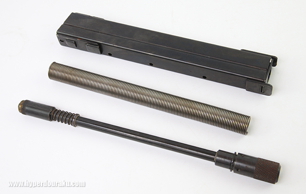 マガジンを構成する3つのパーツ。手前からBB弾マガジン、マガジンガイド、マガジンケースで、マガジンガイドというのはビヨンビヨンと曲がるコイルスプリング。