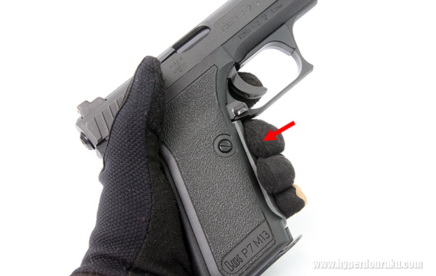 実銃ではスクイズコッカーを握り込むことでストライカーがコッキングされる仕組みだが、ガスガンの場合それは関係ない。しかし、「カッキン」という独特の操作感はかなり実感があり、ギミックとしてはとても面白い。