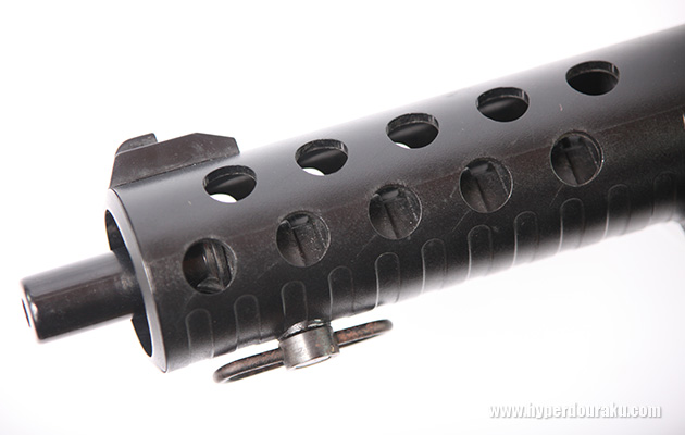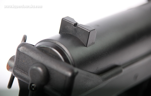 シンプルなリアサイト。実銃同様、正確に狙って撃つ銃ではないためこれでじゅうぶん役に立つ。