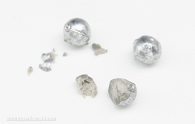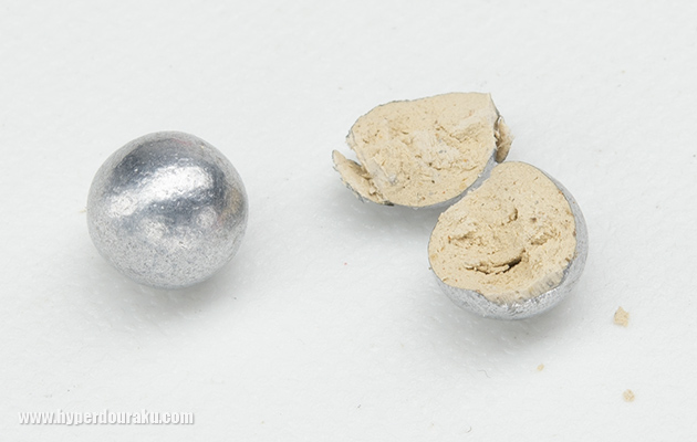 七輪などに使用される植物性の軽い土、珪藻土を丸めた弾で銀色のアルミ粉で着色されている。かなり歪だが直径は6.7~6.8mmほど、重量は約0.18gだ。弾の作成には正露丸などの丸薬を作る機械を利用したという。